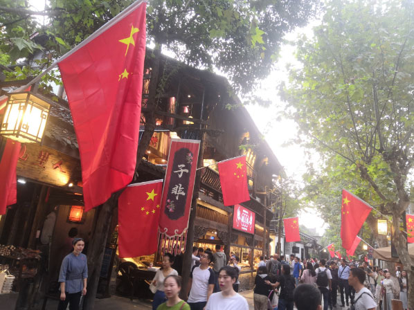 在收到倡议书后,成都各大餐饮门店积极行动起来,纷纷在自己门店内外按规范要求悬挂了国旗,并通过班前会歌舞、诗歌朗诵等形式向员工进行爱国教育。袁记串串香、狮子楼、柴门、眉州东坡、三只耳、茗虾荟、轩轩小院、大蓉和、子非、宽坐、顺心、师徒情人民食堂、蜀大侠等成都知名餐饮店,都第一时间响应,尤其是宽窄巷子等餐饮店集中的街区,一面面国旗迎风招展。